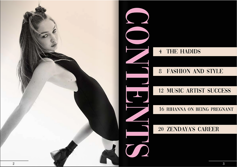 On the left page the photograph of Gigi Hadid is also black and white like the cover, but the photo feels more daring and editorial. It's a full body shot with an interesting over top angle which creates a dynamic diagonal line. Also, the model Gigi Hadid looks directly at the camera, which makes it seem like she is looking at the readers which makes them see her from a more personal and direct perspective. This is fitting because by turning the page, the readers can start reading her segment of the magazine, so the image almost seems to prepare them for that.